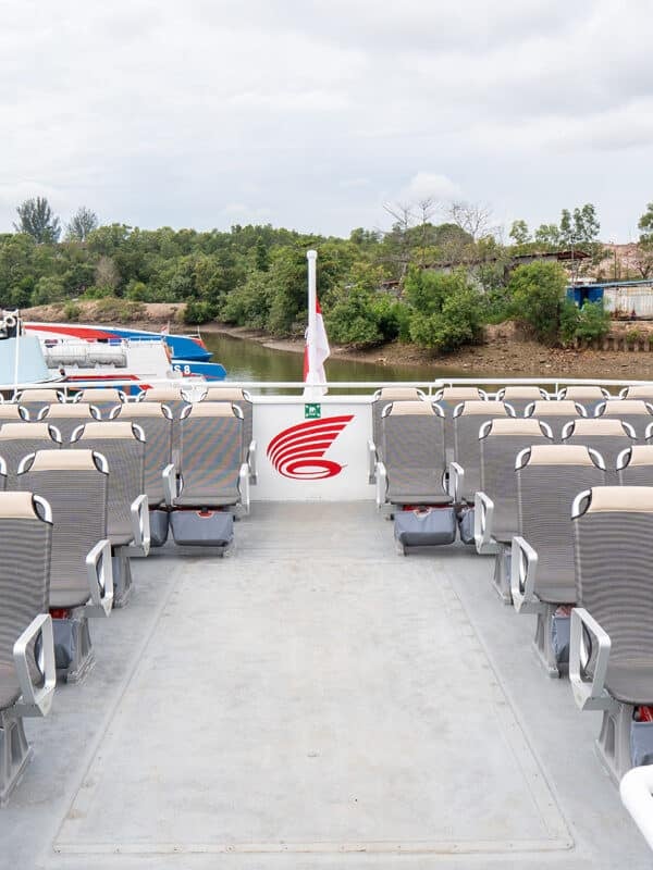 The speedboat offers comfortable air-conditioned seating as well as an open deck area, allowing passengers to enjoy fresh sea air and scenic ocean views during the journey.
